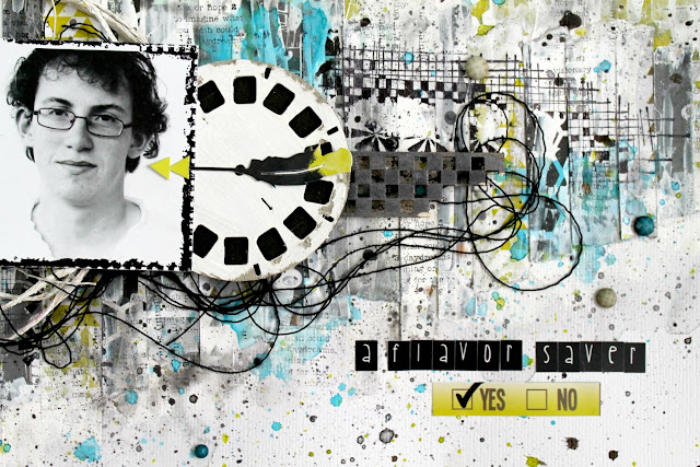 American Crafts Cardstock - White, Grungeboard, Prima Marketing Resin Treasure - Fly Away, Prima Marketing Divine Metal Paper Clip, Prima Marketing Fairy Rhymes flowers, Prima Marketing Wood Icon - Borders, Prima Marketing Rusty Typo Zipper, Prima Marketing Jeans Button, Prima Marketing - Sunrise Sunset Stencil - Checker, Prima Marketing Stencil - Flourish, 2 Crafty ATC Chipboard, Black Thread, Paper Clip, Glass Cabochan, Scrap Metal. Pro-Art Gesso, Luminarte Twinkling H20 Watercolor - Pewter & African Jade, Atelier Texture Paste, Faber-Castel Gelato - Blue, Ranger Archival Ink - Black, Kaisercraft Stamp - Sketchy, Stampendous Stamp - Text, Unity/Donna Downey - Art & Possibility Stamp, Prima Marketing - Romance Novel Stamp, Prima Marketing - Lifetime Stamp, Tim Holtz - Filmstrip Stamp.